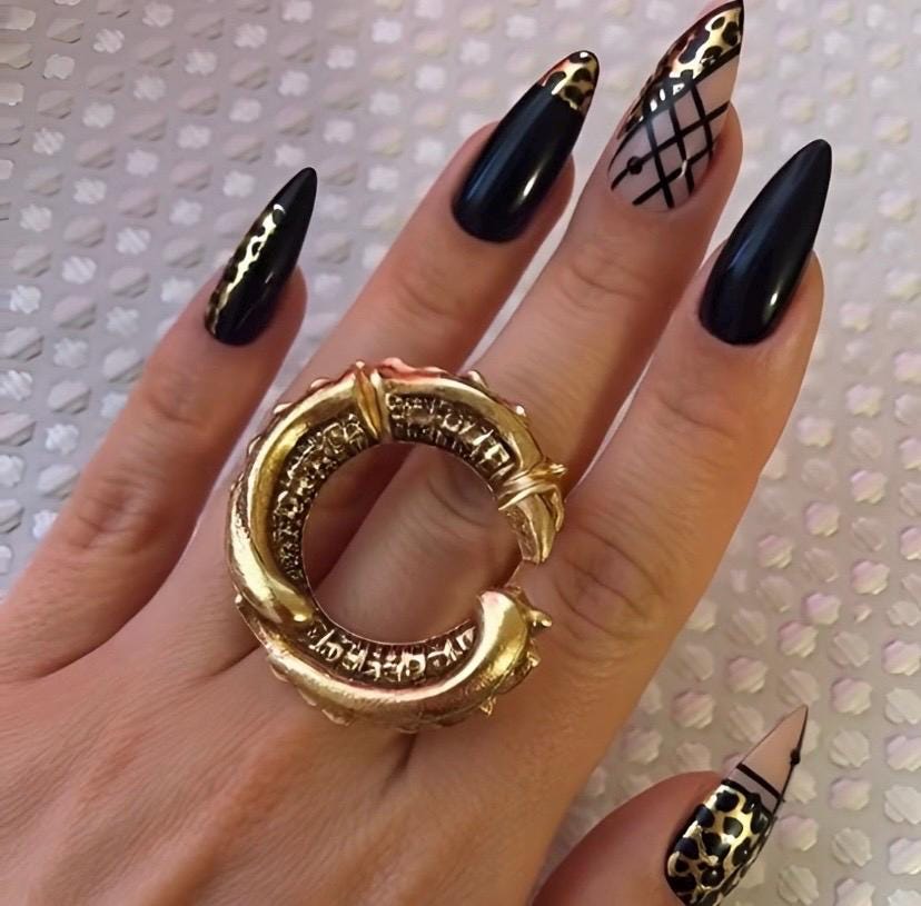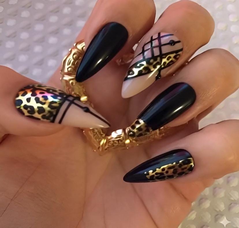 These leopard print black/nude and gold detail with black line work Press on Nails are hand painted, using Uv/Polygels/Hybrid gels ,Dips and Acrylics..!!!!!!!!!